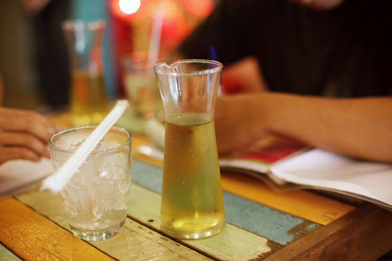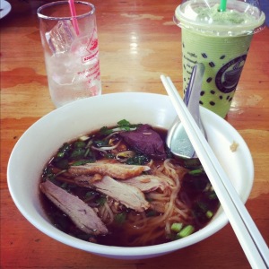Około południa kolejny kumpel chciał się spotkać, więc poszliśmy do restauracji słynącej z dobrej kaczki. Na zdjęciu rewelacyjna zielona herbata o smaku ryżu! Champ miał pełną lodówkę tych butelek, których zawartość szybko pokochałam.